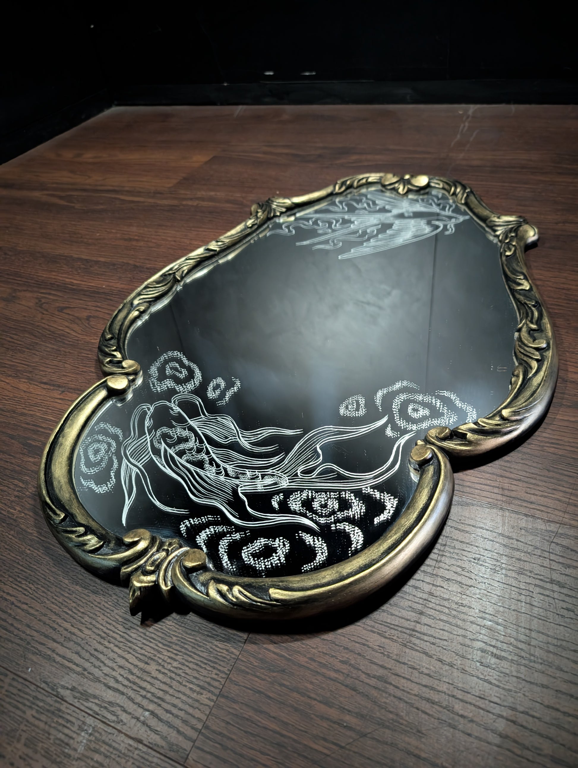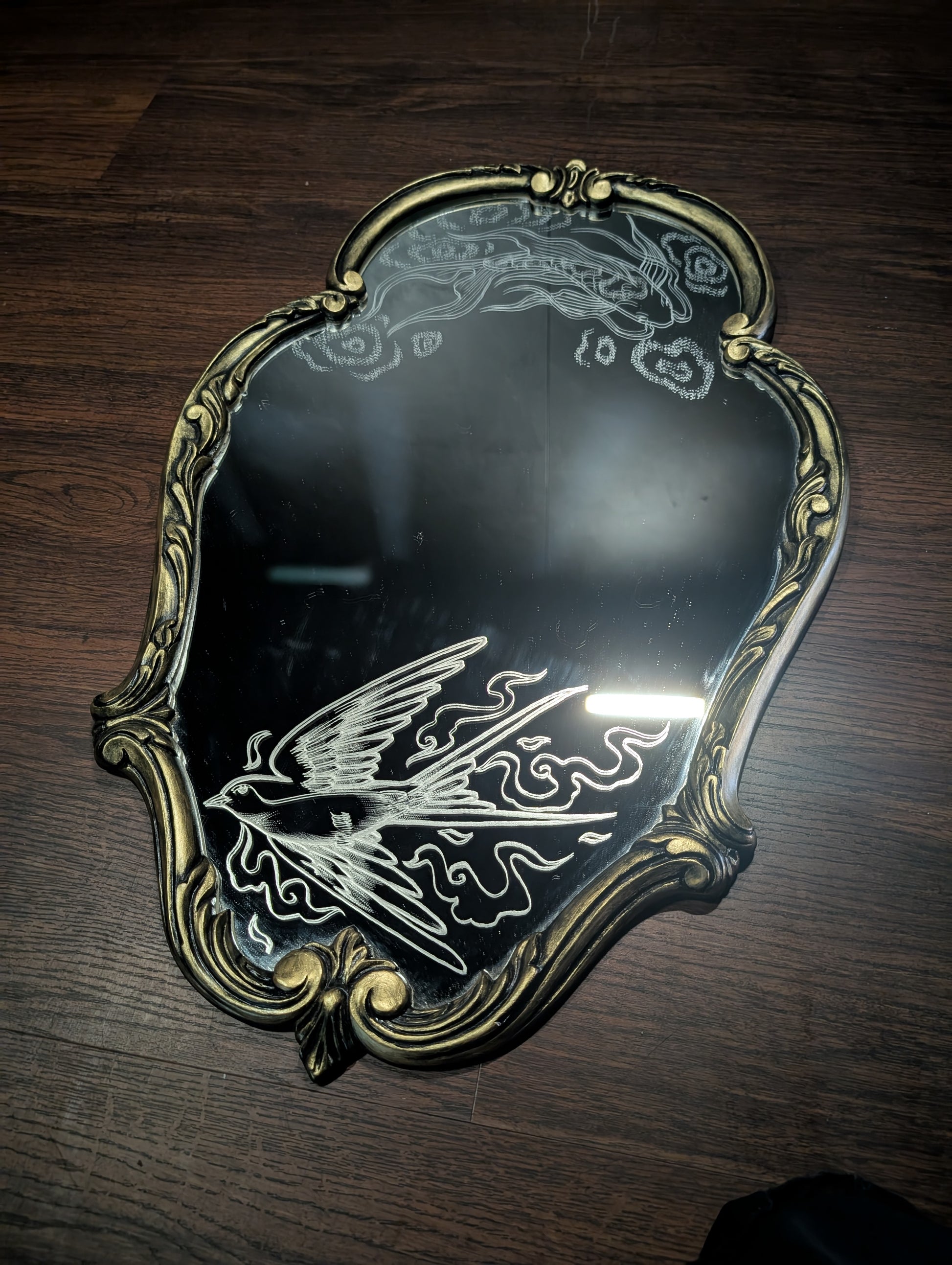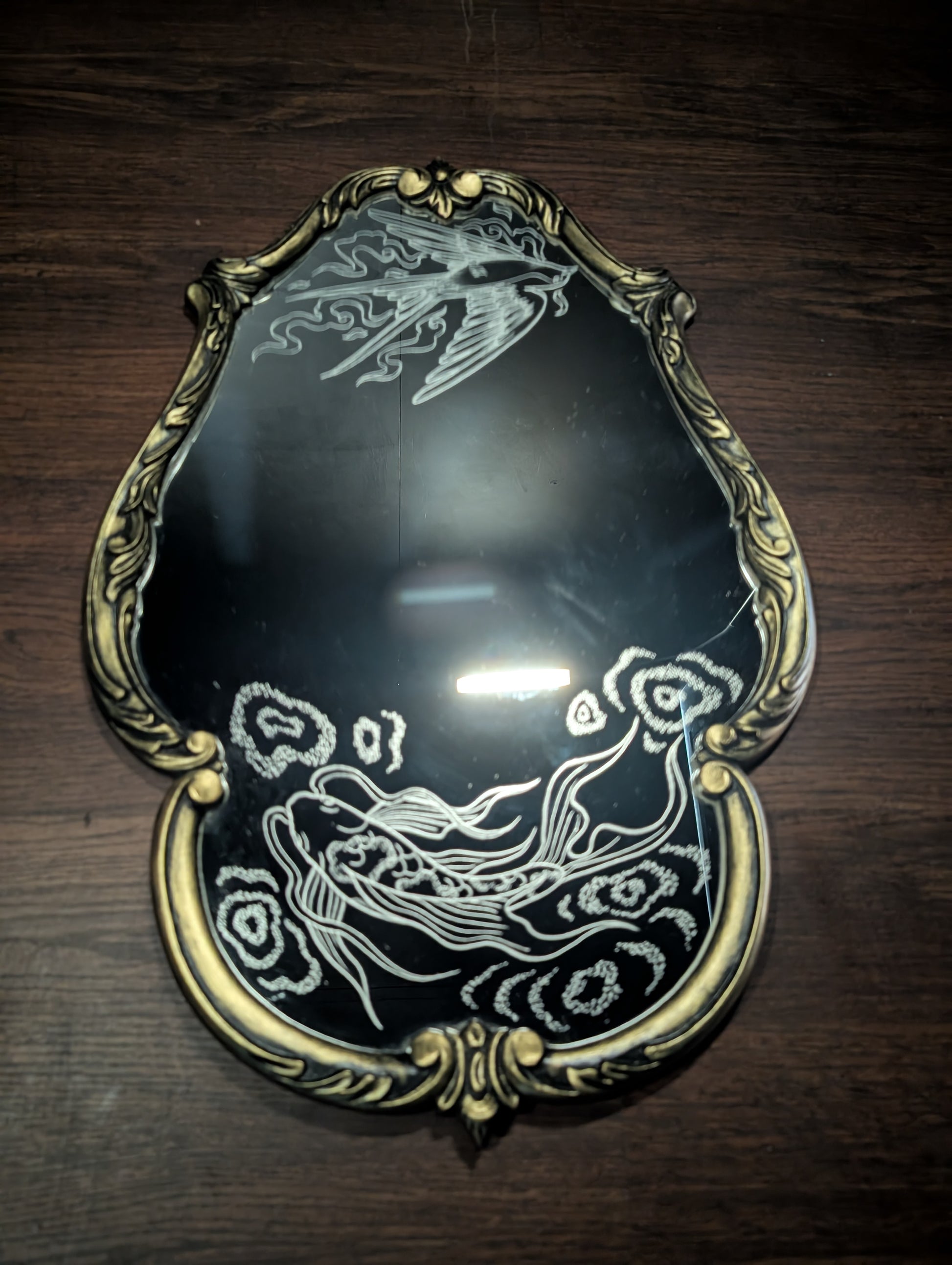 Koi fish in ripples of water and a Swallow bird in whisps of smoke. Engraved by hand using a dremel using an original design. Newly painted frame black and gold.